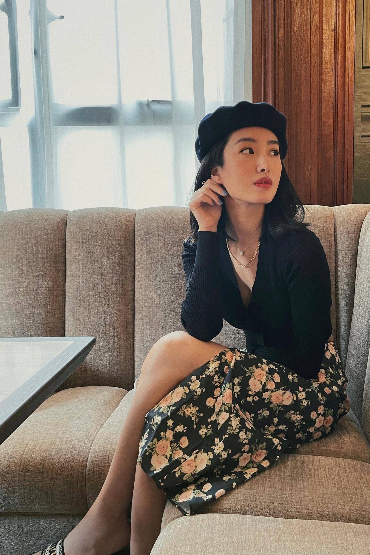 下半身的印花半身裙还演绎出了浪漫的气质,和她的整体风格并不违和。