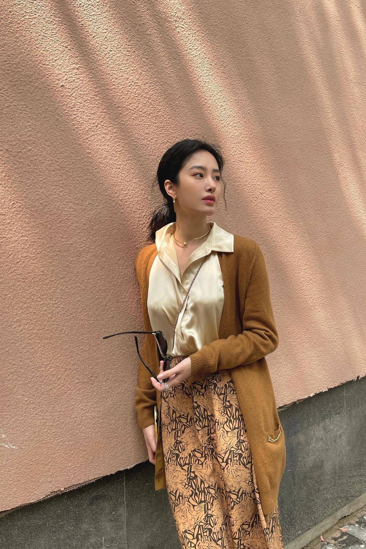 入秋之后,肯定有很多小姐姐穿上针织衫了吧,如果你觉得针织衫的搭配容易显胖,直接在里面叠穿衬衫会很好看,并且也会显得比较简洁,而且杨采钰选择这种棕色针织衫搭配了黄色的衬衫,时尚度也很高。
