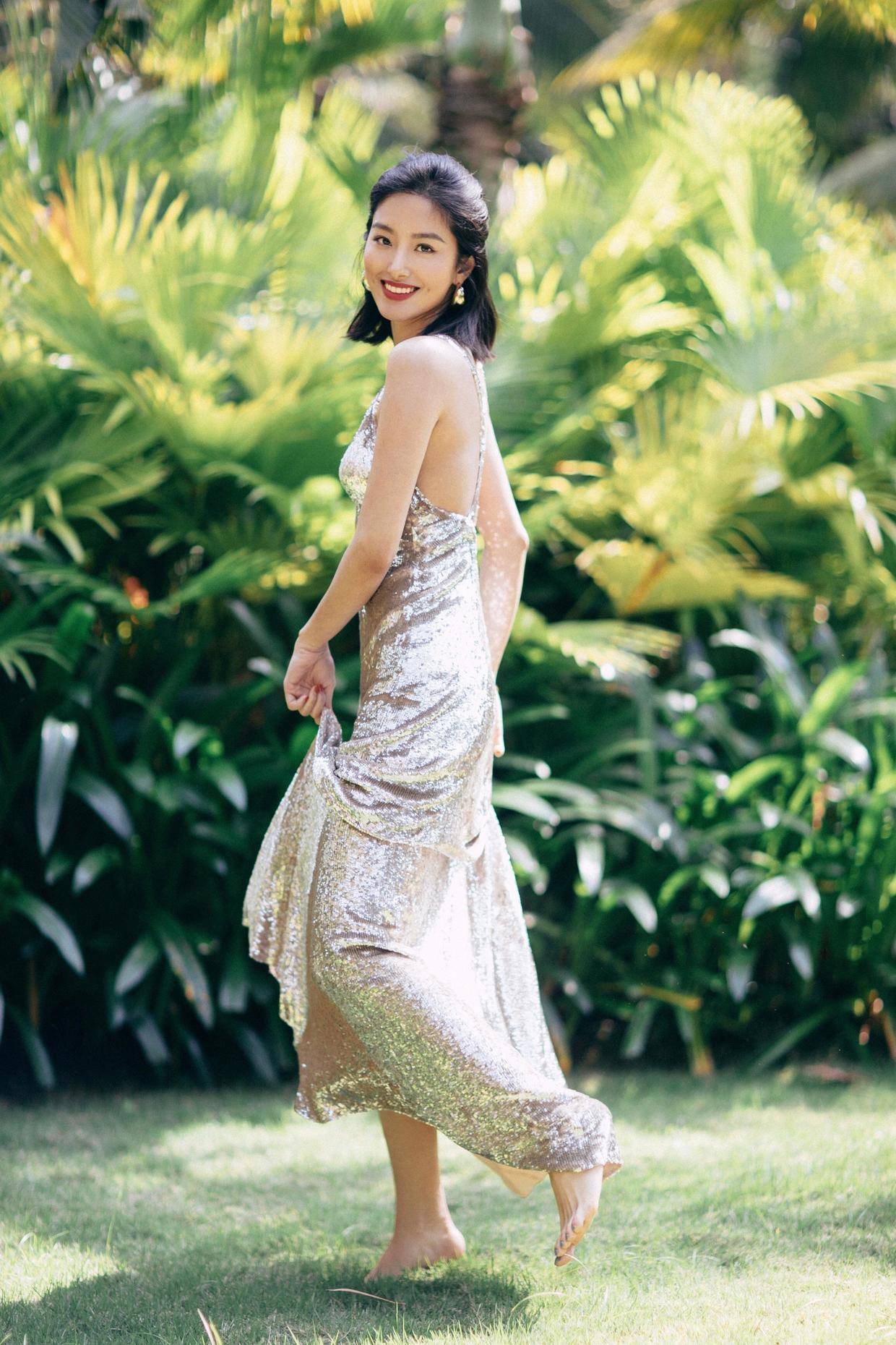 露背裙装对于杨采钰来说也是凹造型的利器,毕竟她身材好,后背也没有赘肉,穿上这种亮丽的银色露背连衣裙,也可以体现大面积的肌肤,时尚度爆棚哦,非常适合约会或者是参加活动,能赚足回头率。