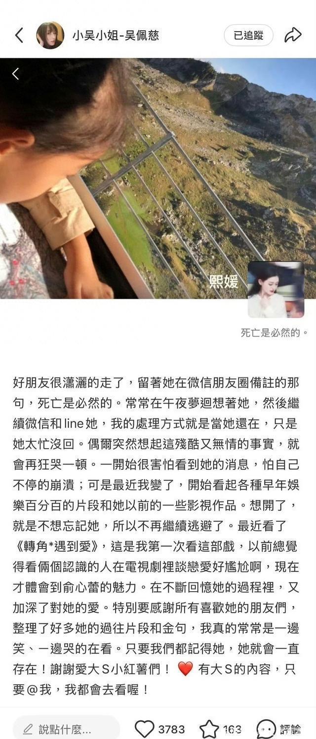 距离大s去世已经过去了四五个月时间了,但是有圈内好友点开大s的朋友圈,她置顶的内容再次让人泪奔: 朋友圈备注:死亡是必然的! 简简单单一句话,早已经将生死看的很淡。 曾经的大s曾经在一档综艺节目里说过这样一段话。 在这边真的要和所有年轻人讲一句话,不管你这辈子做过多严重的事情,或者是你犯了多大的错误,可是只要你活下去,事情都一定会有转机。 只要你愿意改变或者愿意认错的话,那段时间虽然很痛苦很难熬,但是只要你熬过了那段时间,你的人生都是还有机会和希望的。 所以千万不要轻易放弃自己的生命。